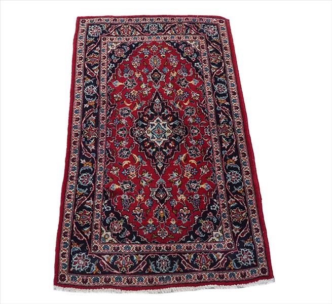 Tapete persa Kashan, decoração clássica com medalhão central em azul-claro sobre campo vermelho intenso, preenchido por arabescos florais em tons de azul, bege, amarelo e marfim; elementos em forma de palmetas e rosetas estilizadas distribuídas simetricamente; borda tripla com faixa principal em fundo azul-escuro, decorada por florões entrelaçados por gavinhas, ladeada por bordas secundárias com flores em sequência sobre fundo claro; 177 x 95 cm = 1,68 m²