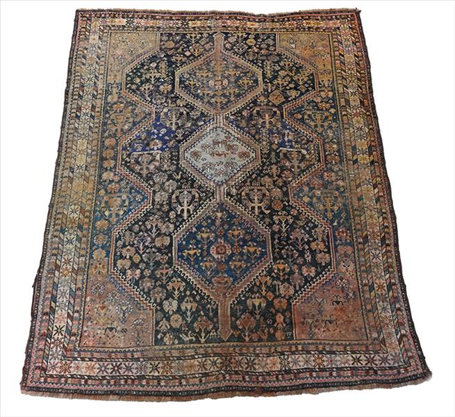 Tapete persa Shiraz com composição central em colunata vertical de medalhões hexagonais escalonados sobre campo negro com elementos florais dispersos em arranjo livre, ladeado por quatro cantoneiras em fundo rosado com arabescos arbóreos e serrilhado interno destacado, motivos florais estilizados e pequenos buquês povoam o campo escuro em alternância cromática com os medalhões em azul, marfim e ferrugem, borda principal com faixa de estrelas multicoloridas sobre fundo bege, ladeada por guardas menores com folhagens diagonais, fatura fina e desenho levemente assimétrico, lã macia com abrasão natural e tons suavizados pelo tempo, 232 x 176 cm = 4,08 m², oeste do Irã, c. 1920 (rape / precisa refazer cordão)