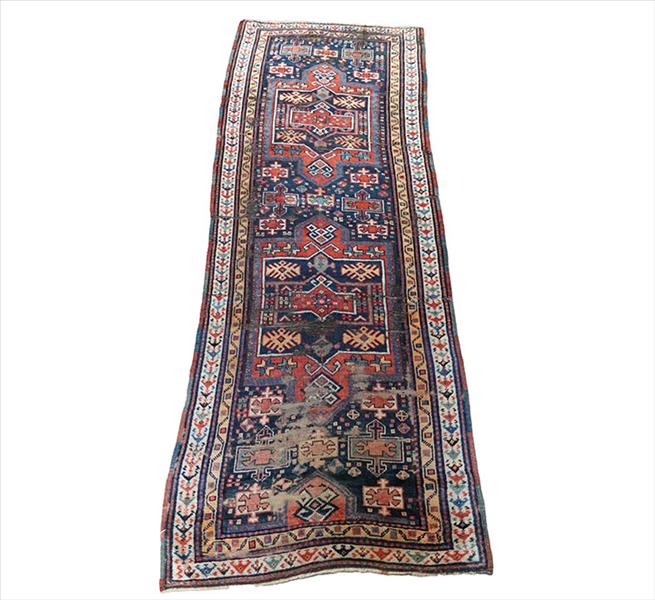 Tapete tribal caucasiano da região do sul do Azerbaijão, província de Quba, tipo Shirvan, formato rape com composição axial de medalhões geométricos octogonais e cruziformes em sequência sobre campo azul marinho com motivos secundários estilizados e pequenas figuras em forma de pássaros, estrelas e ganchos, borda principal em fundo marfim com padrão de motivos serrilhados em cores alternadas, ladeada por faixas internas e externas com grafismos geométricos sobre amarelo e azul, lã sobre lã com nós assimétricos e fiação espessa, paleta intensa com predominância de azul marinho, vermelho ferrugem, marfim, amarelo e turquesa, 360 x 123 cm = 4,42 m², Cáucaso Oriental, início séc. XX (rape / com desgastes)