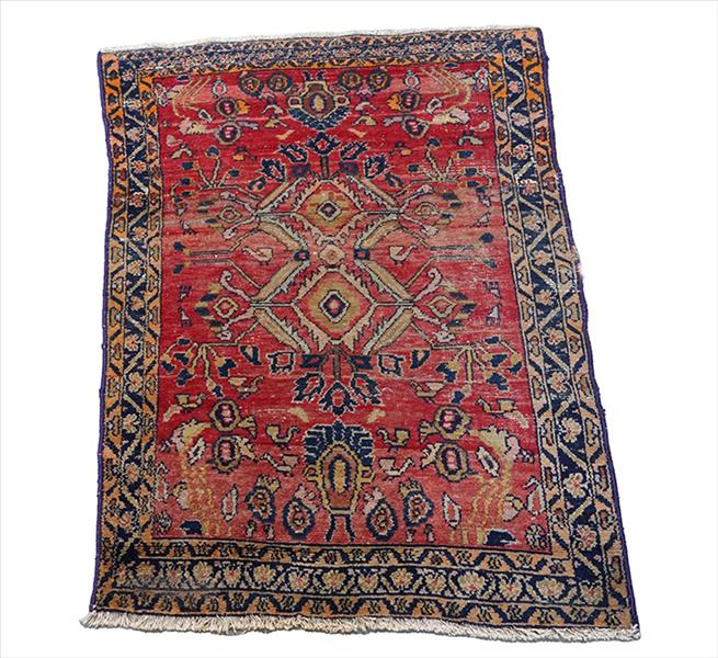 Tapete tribal do Irã ocidental, região de Hamadan, provável produção de aldeia como Zandjan ou Hoseinabad, campo vermelho-coral com medalhão central losangular escalonado ladeado por palmetas rústicas, botehs assimétricos e ramos florais estilizados, borda principal em fundo azul marinho com lianas contínuas entre cartuchos florais, paleta viva com tons de vermelho, azul escuro, dourado, rosa e bege, desenho espontâneo com variações laterais e assimetrias típicas de tecelagem aldeã, desgaste moderado, necessita refazimento de franjas e cordão, 148 x 100 cm = 1,48 m² (Rape / precisa refazer franja e cordão)