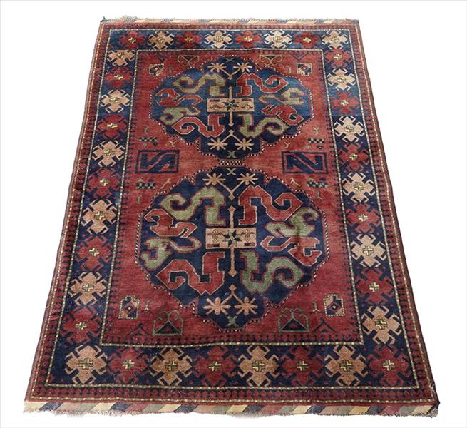 Tapete caucasiano tipo Kazak Karachopf, decoração com dois grandes medalhões octogonais interligados, preenchidos por ganchos estilizados, cruzes duplas e rosetas de oito pontas, campo em tom vermelho ferrugem, medalhões em azul marinho e verde musgo, borda tripla geométrica com cruzes estilizadas e meandros, 295 x 200cm = 5,90m², circa 1920