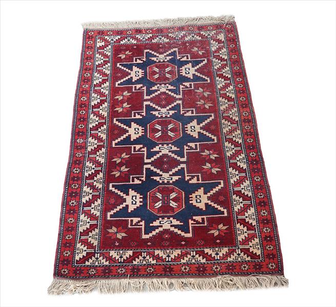 Tapete Kazak, decoração geométrica com estrelas octogonais e motivos em gancho, tonalidade predominante vermelho com detalhes em azul escuro e marfim, campo axial com repetição de medalhões estilizados, borda tripla geométrica, 199 x 107 cm = 2,13 m², ca. 1930