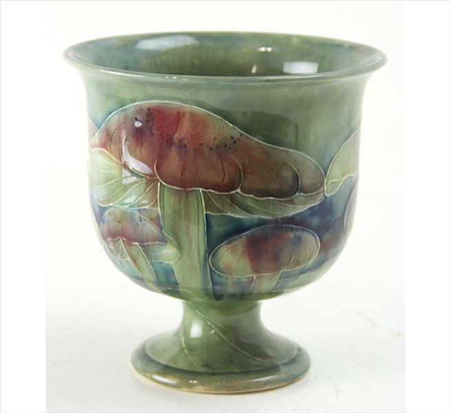 WILLIAM MOORCROFT, Floreiro de faiança ricamente esmaltada, técnica dita Florian Ware - fortemente inspirada no movimento Art-Nouveau, ornamentado com figuras de cogumelos, assinado sob a base. Alt. 14 x 14cm. Inglaterra, período George V - 1916.