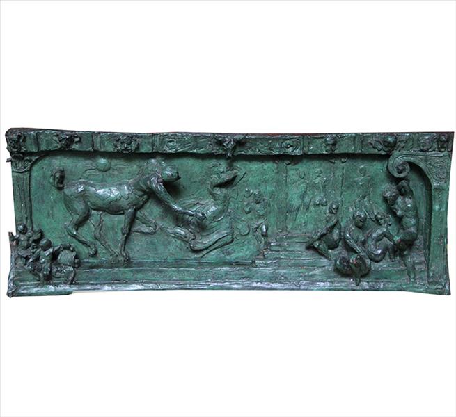 Grande placa de bronze, decorada com cena de minotauro e figuras em alto relevo, assinatura de artista não-identificado. Alt. 42 x 109 x 11cm. Provavelmente Itália, século XIX