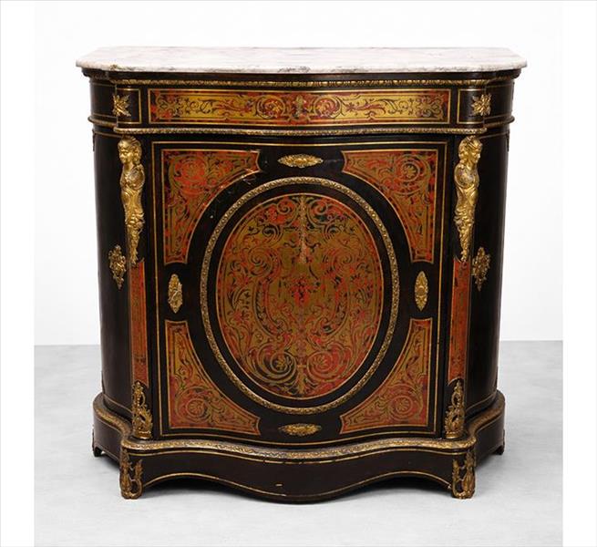 Dunquerque estilo Boulle, madeira ebanizada, ricamente decorada com marchetaria de bronze dourado floral sobre placas de tartaruga, ornamentada com cariátides em reservas laterais, parte interna revestida de veludo na tonalidade vinho, tampo de mármore branco. Alt. 105 x 114 x 44cm. França, séc. XIX/XX (faltam alguns detalhes / com desgastes)