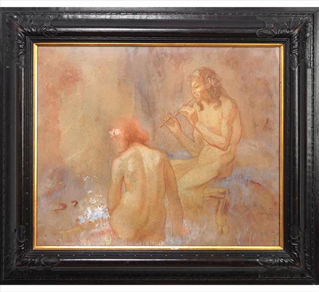 Quadro com assinatura de artista ilegível, Fauno e Bacante, Sanguínea e Aquarela sobre Papel, ACID, 43 x 53cm (m.i). Datado 1911