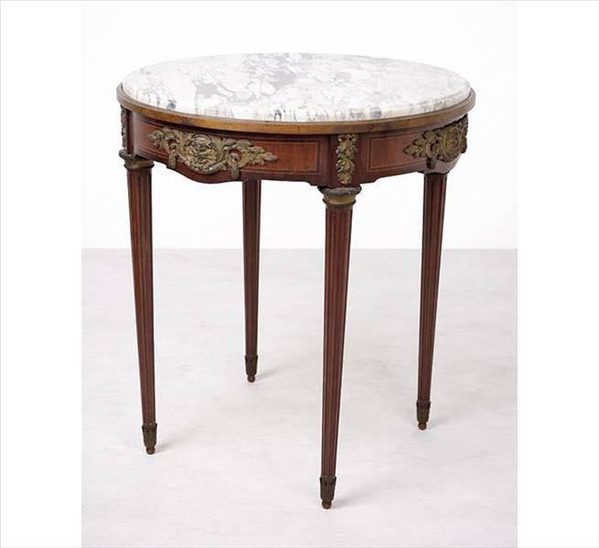 Mesa lateral de madeira, pernas cilíndricas com caneluras, decorada com guarnições e detalhes de bronze, tampo circular de mármore branco. Alt. 76 x 60cm. Europa, séc. XIX/XX