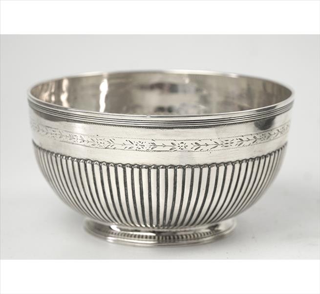 Bowl de prata-de-lei, contraste P Coroa, marca do prateiro ilegível, ornamentado com caneluras, bocal com ramagens estilizadas. Alt. 08 x 14cm. Portugal, início séc. XX