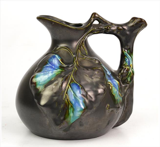FIVES LILLE, Jarra de cerâmica esmaltada, estilo e época Art-Nouveau, ornamentada com ramagens estilizadas, marca da manufatura sob a base. Alt. 15 x 16 x 15cm. França, séc. XIX/XX