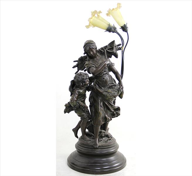 AUGUSTE MOREAU, grande Escultura de petit bronze com resquícios de patina, representando figura de camponeses, com luminária de três pontos na parte de trás, assinada. Alt. 80 x 40 x 30cm. França, séc. XIX/XX