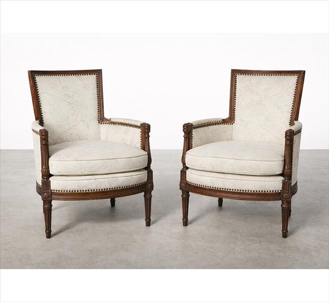 Par de poltronas com estrutura de madeira entalhada, estilo Luís XVI, pernas caneladas terminando em rosáceas, forração de tecido floral em tom off-white. Alt. 92 x 62 x 62cm cada. Europa, séc. XX